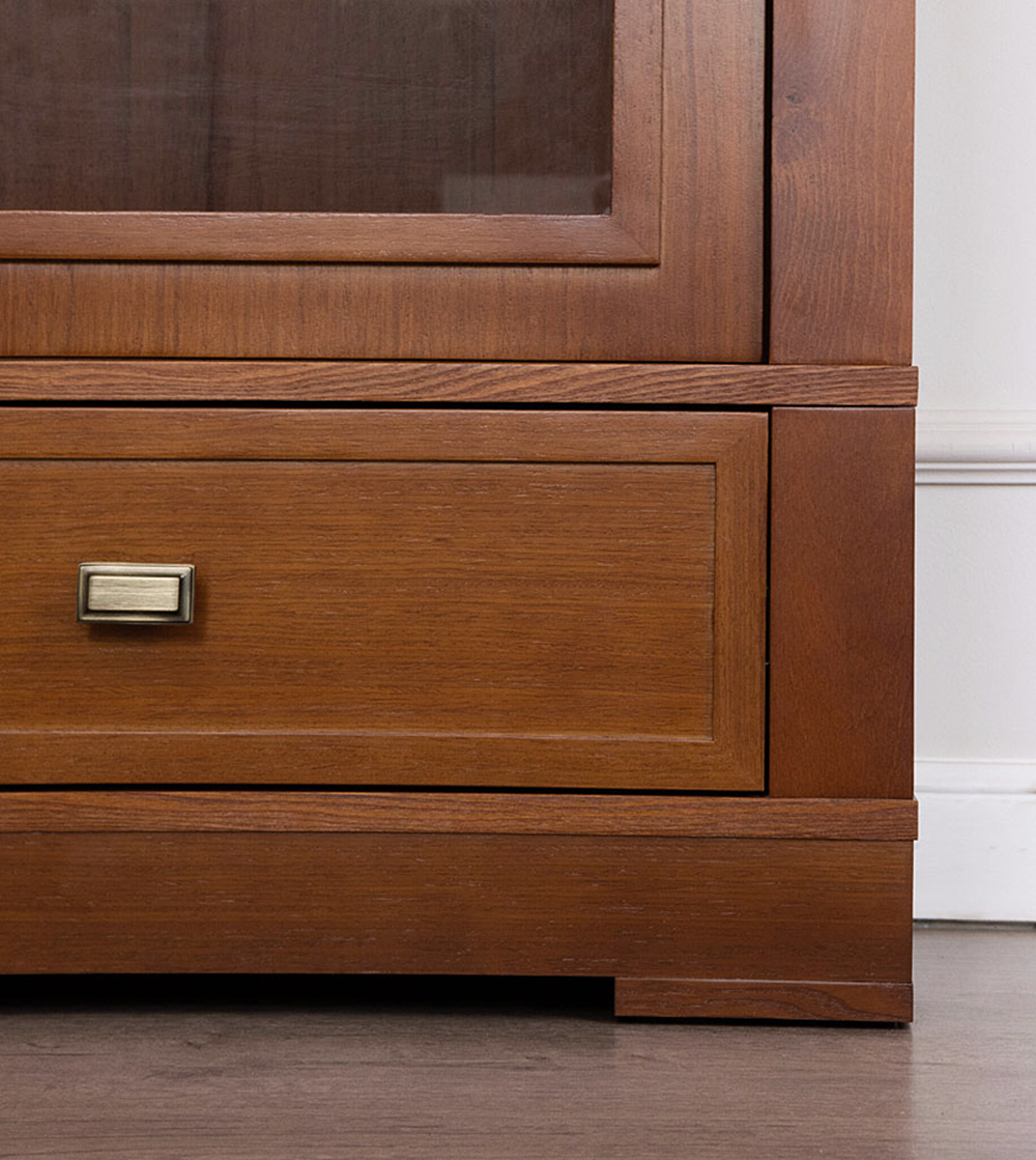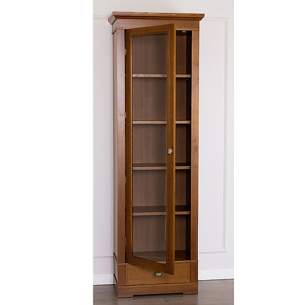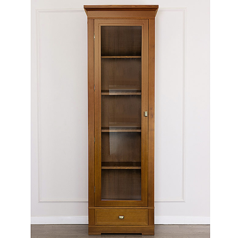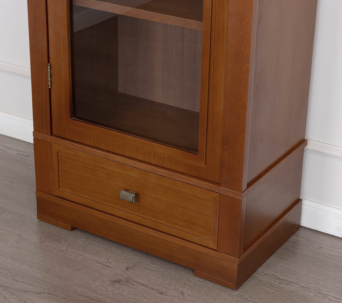 Дверь со стеклом, правое и левое открывание, четыре полки, ящик на роликовых полозьях, отделка натуральный шпон.