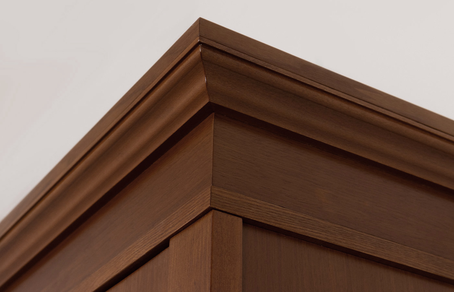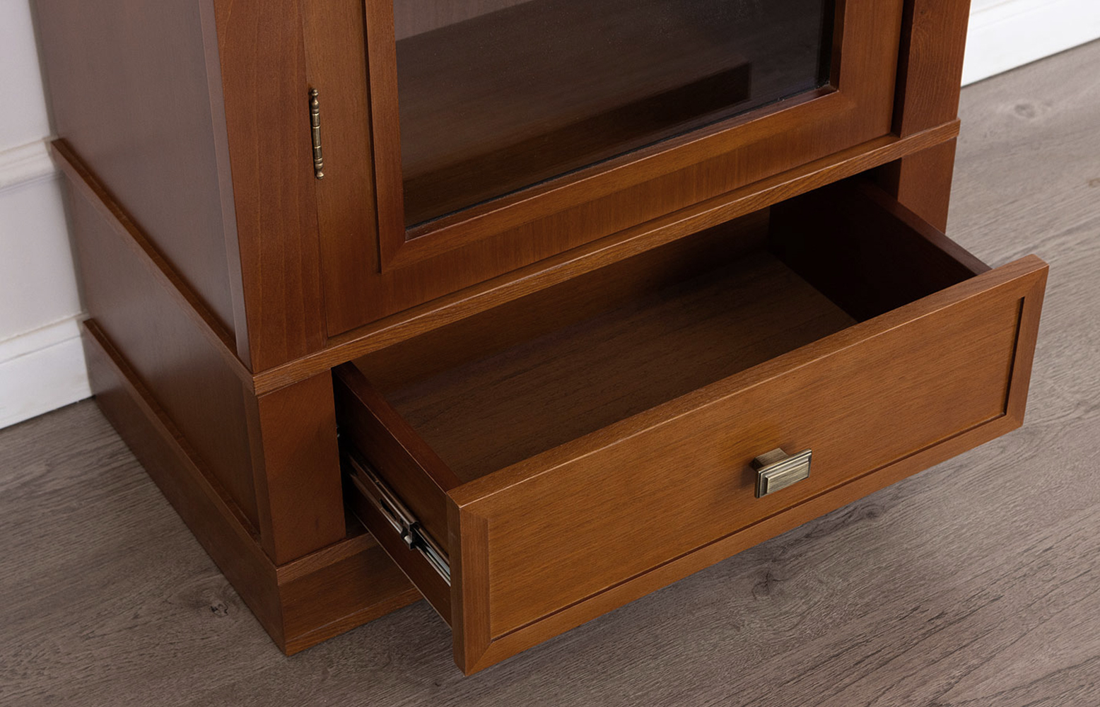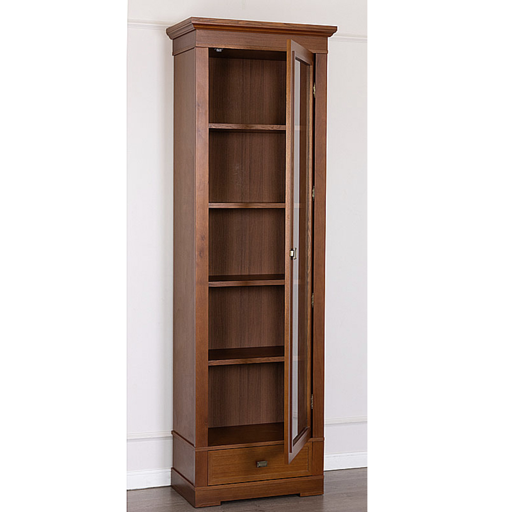 Дверь со стеклом, правое и левое открывание, четыре полки, ящик на роликовых полозьях, отделка натуральный шпон.