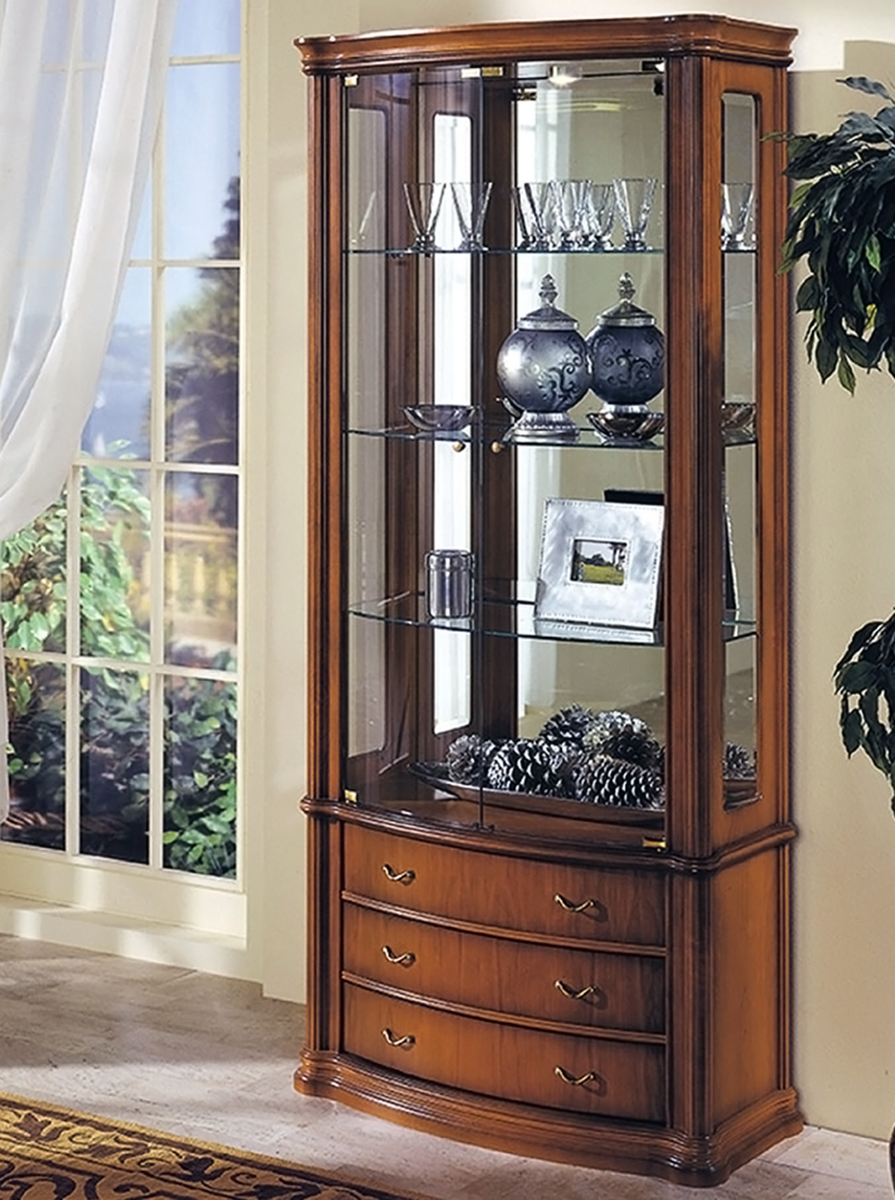 Две распашные стеклянные дверцы, LED подсветка, съемные стеклянные полки, стеклянные боковины, три выдвижных ящика с доводчиком.