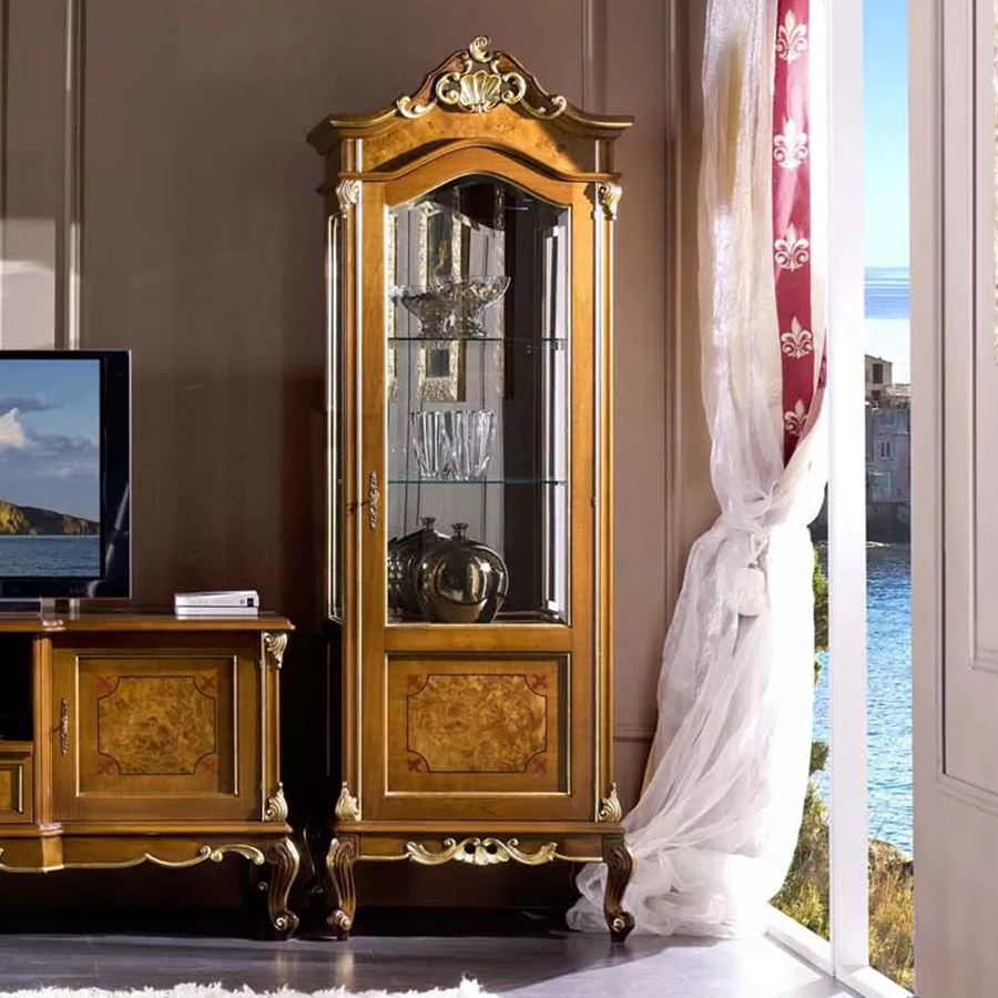 Верхняя часть витрины оснащена стеклянными полками и прозрачными боковыми вставками, что позволяет выгодно демонстрировать сервиз, хрусталь и интерьерный декор. Изящные резные ножки и декоративные элементы с золотым патинированием придают модели благородный аристократический характер.