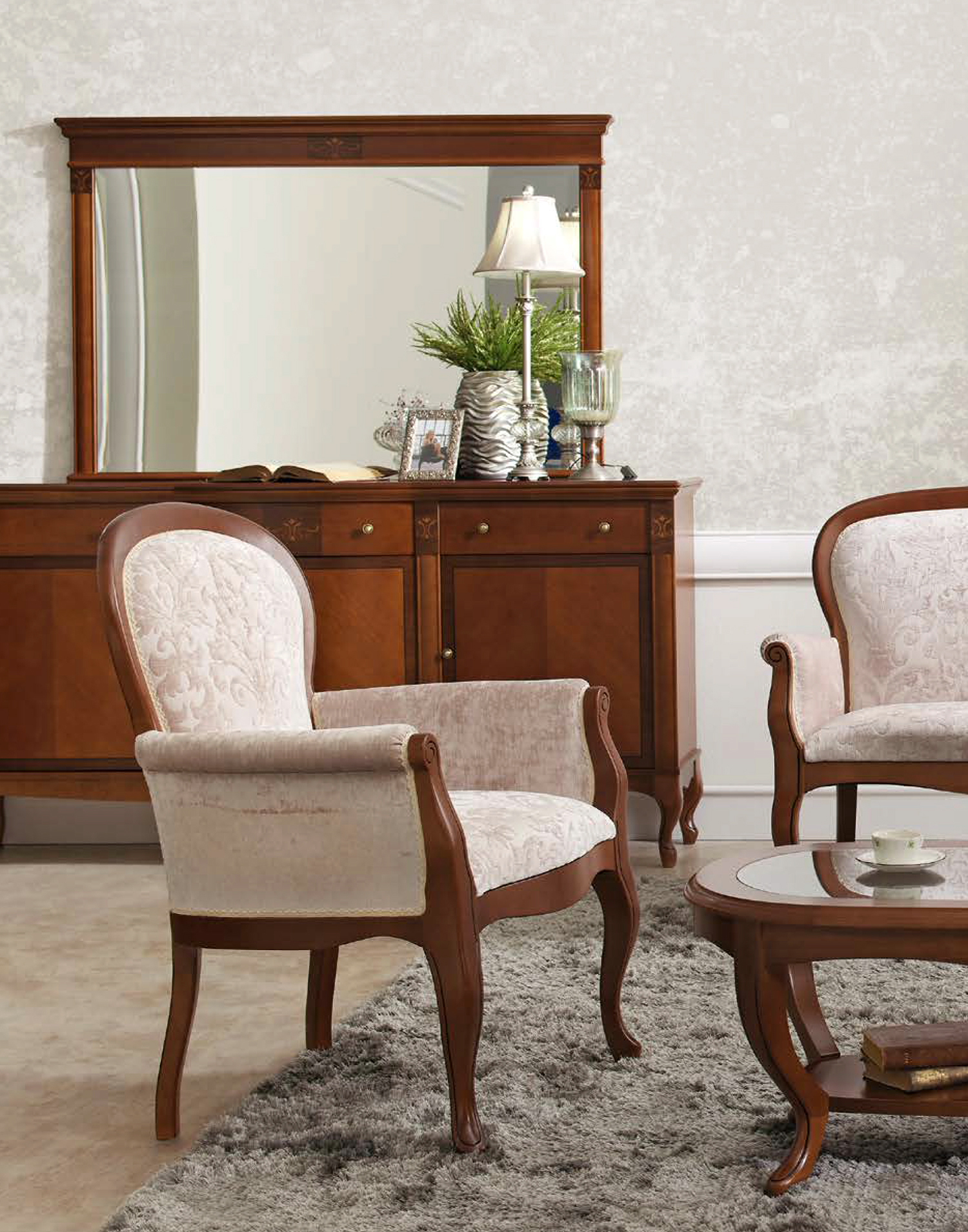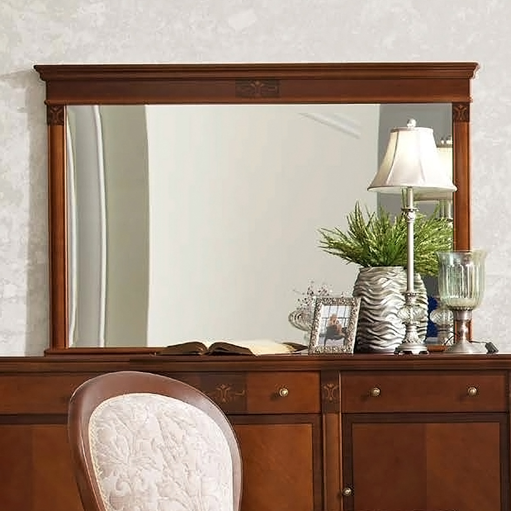 Каркас выполнен из массива бука. На карнизе присутствует рисунок шпона — маркетри. Стекло с фасками.