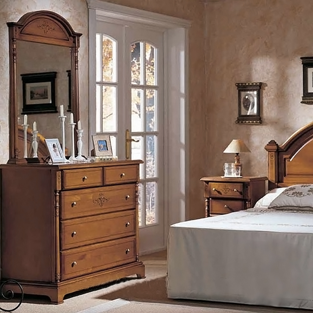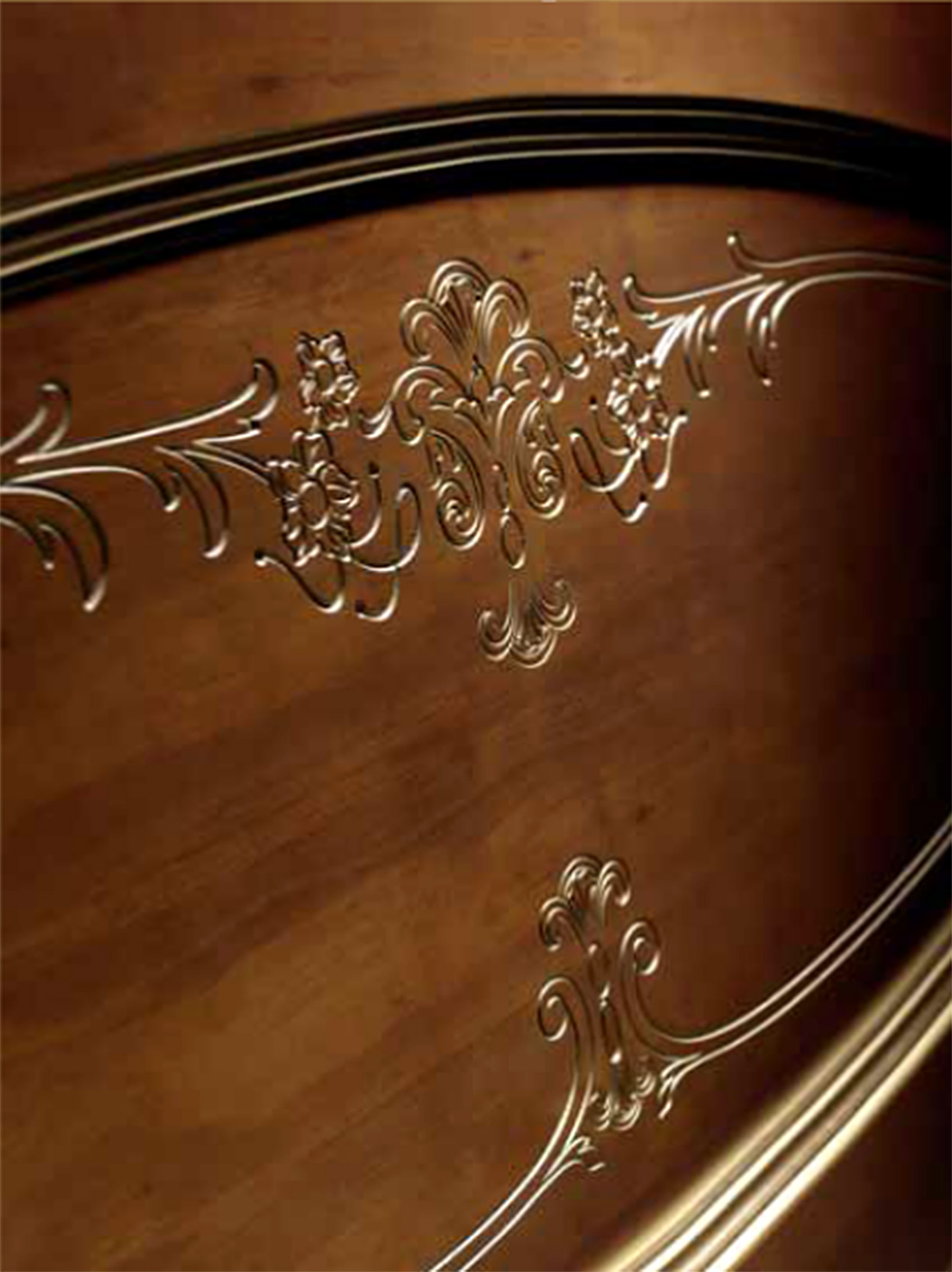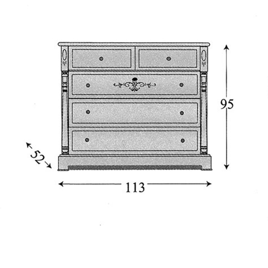 Пять выдвижных ящиков, резьба по дереву на фасаде.