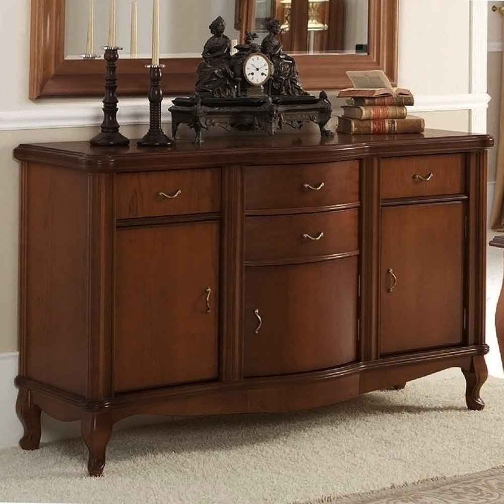 Большой буфет на ножках с тремя дверцами и четырьмя ящиками на роликовых полозьях.