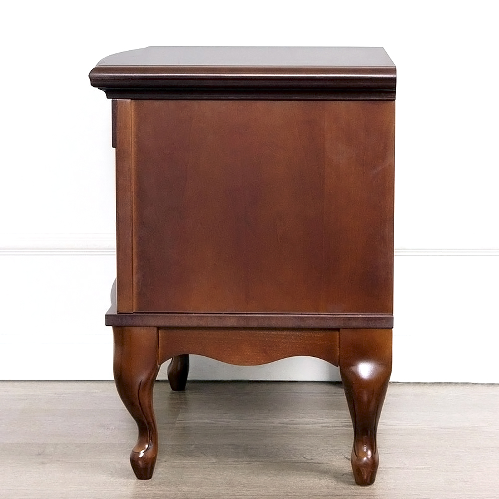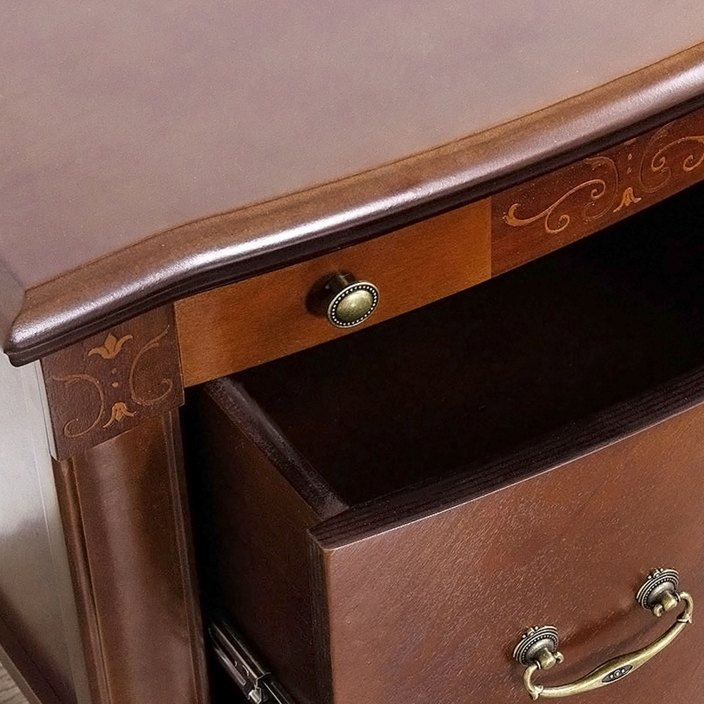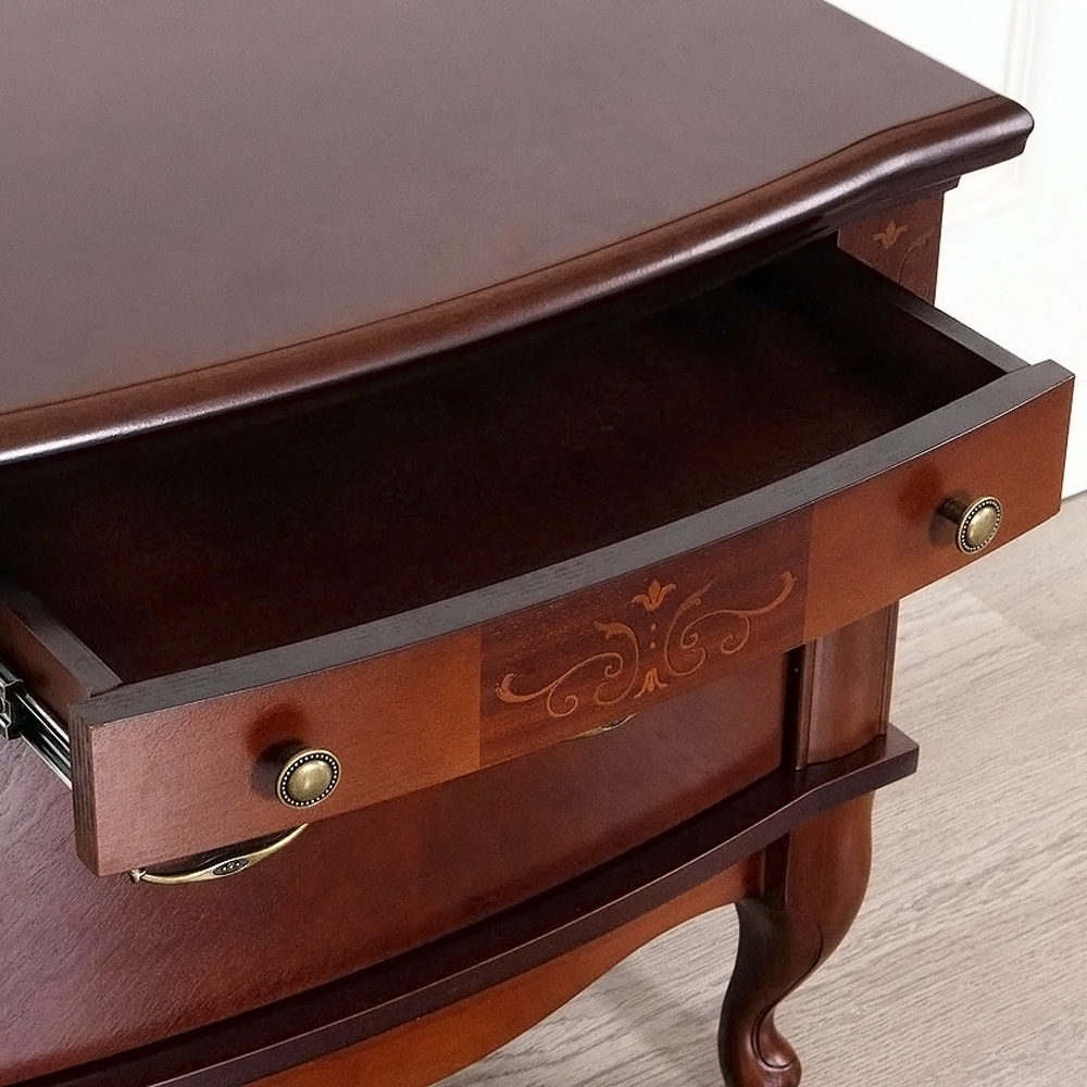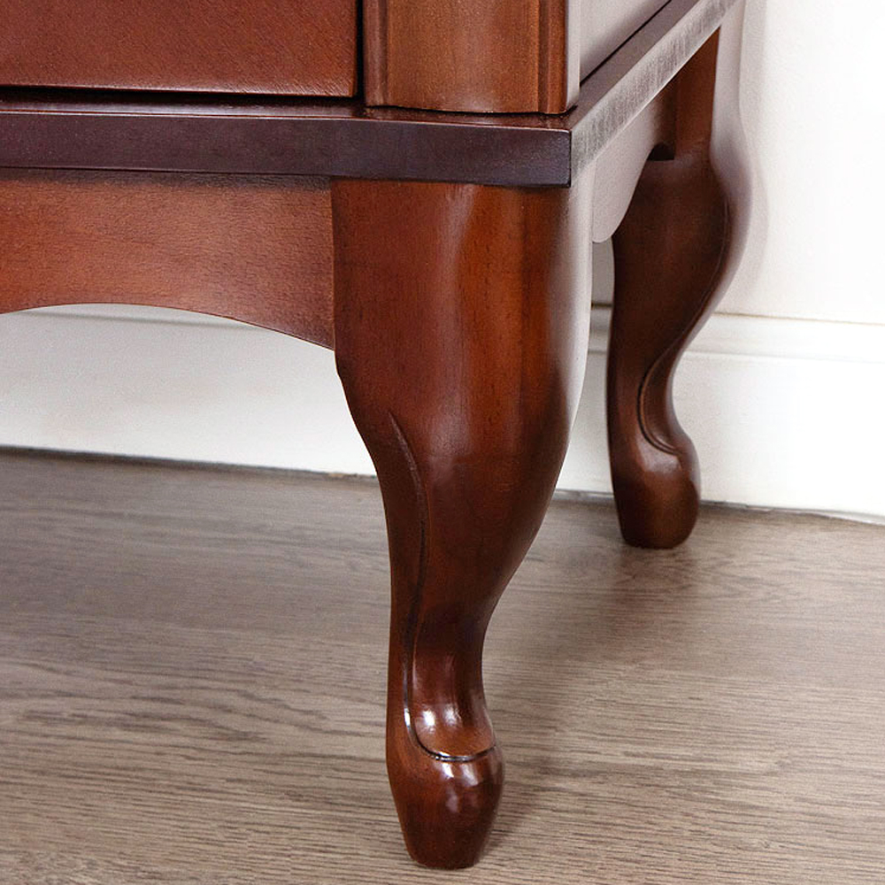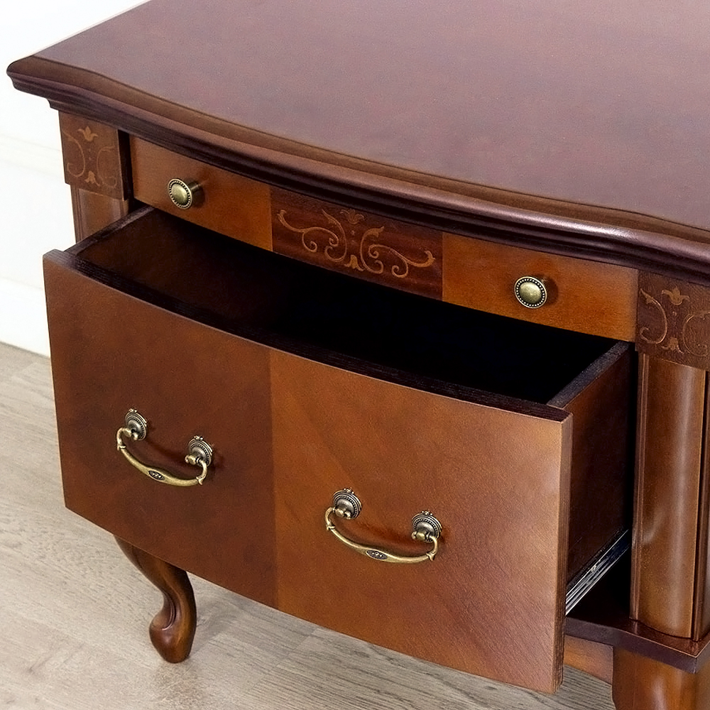 - Благородный внешний вид. Тумба выполнена в классическом стиле с плавными линиями и фигурными ножками, которые придают мебели утонченность и легкость.