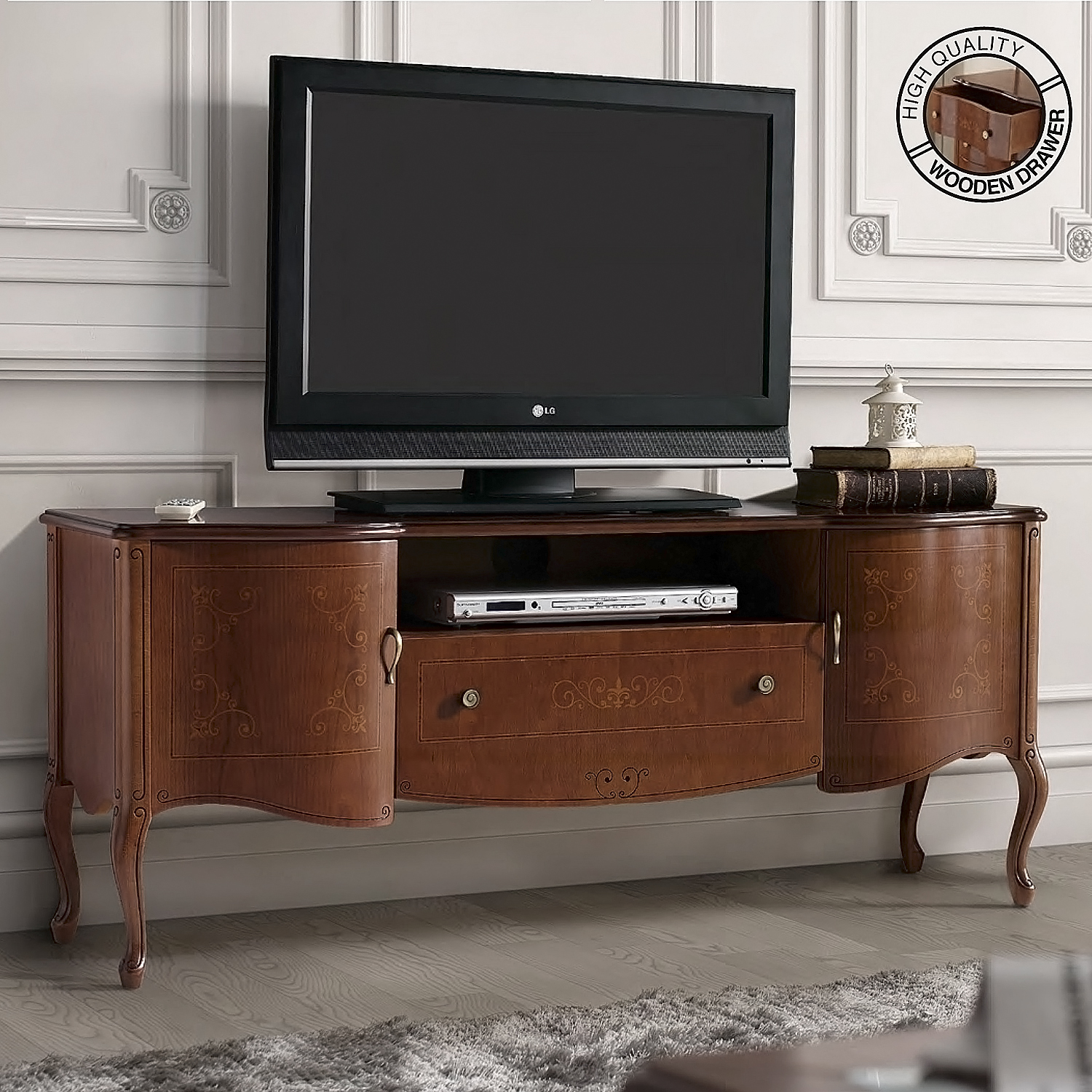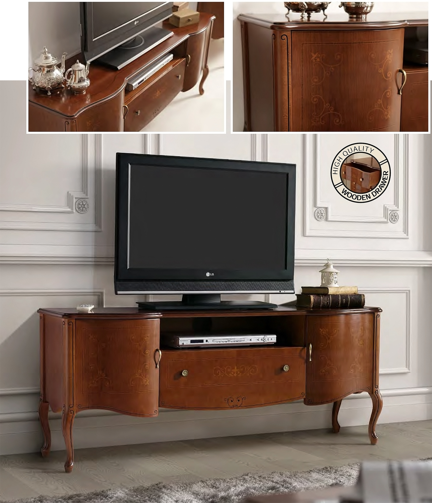 - Изящный дизайн: изогнутые ножки с фигурной резьбой, выпуклая форма фасада и декоративные элементы создают ощущение утончённости.