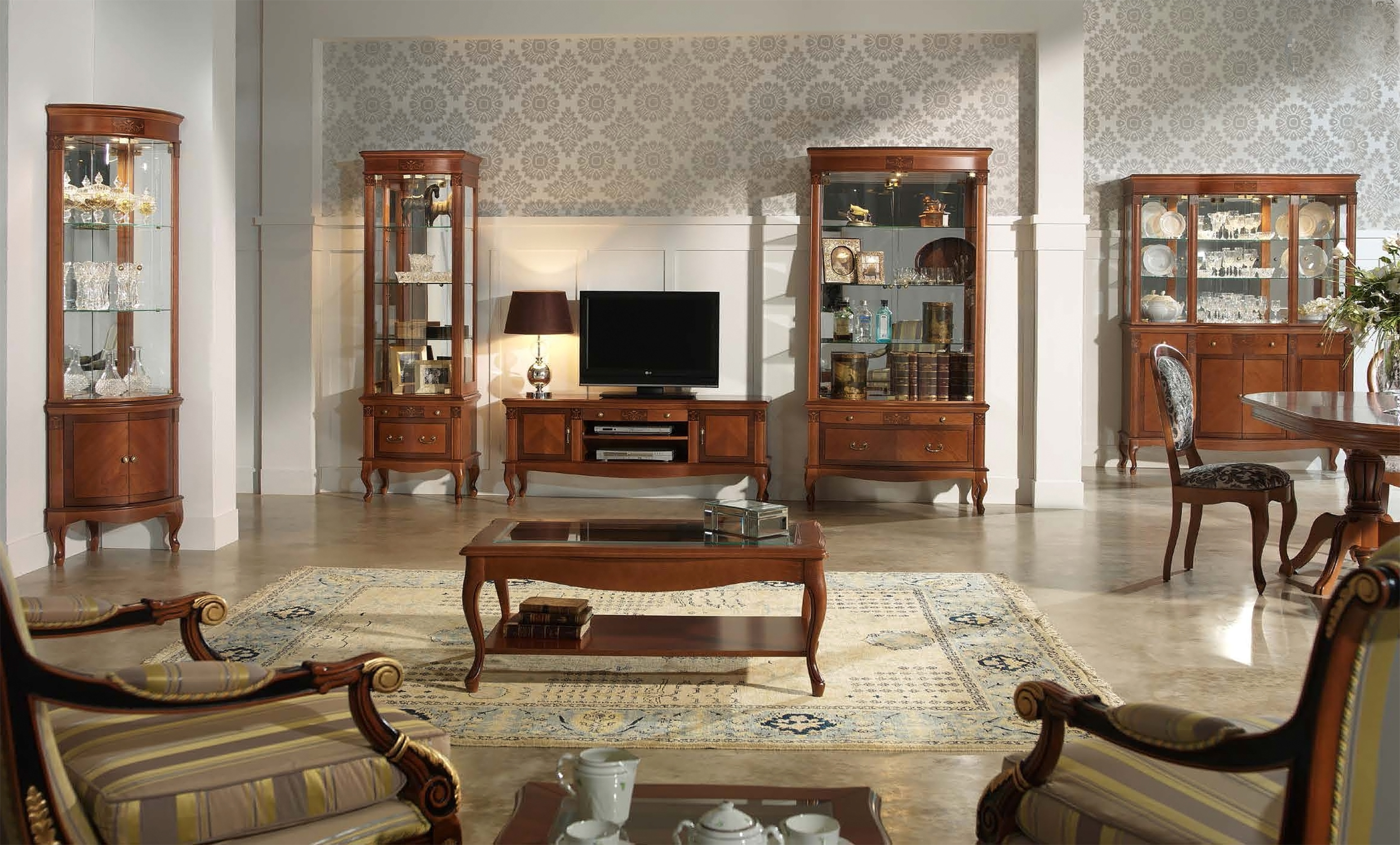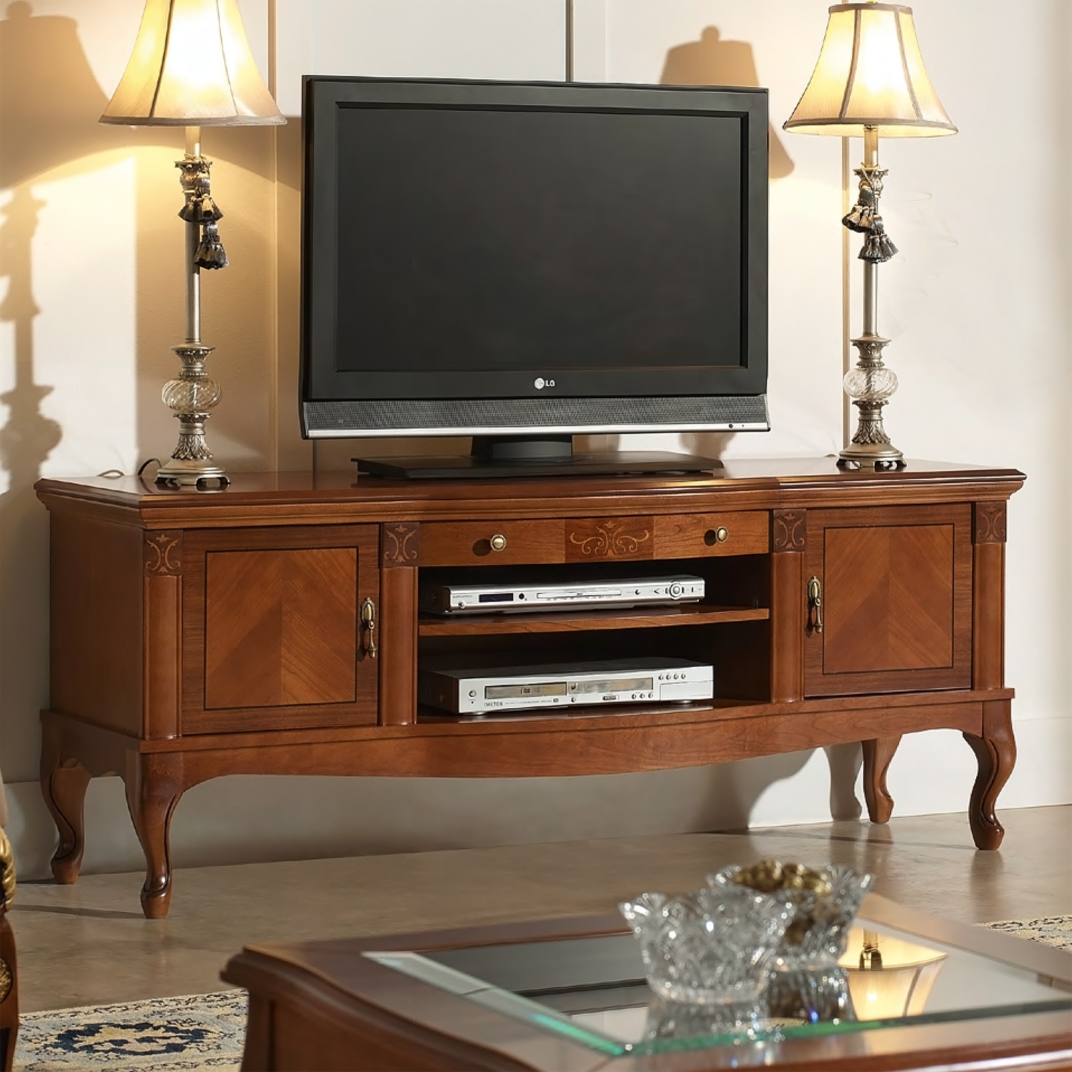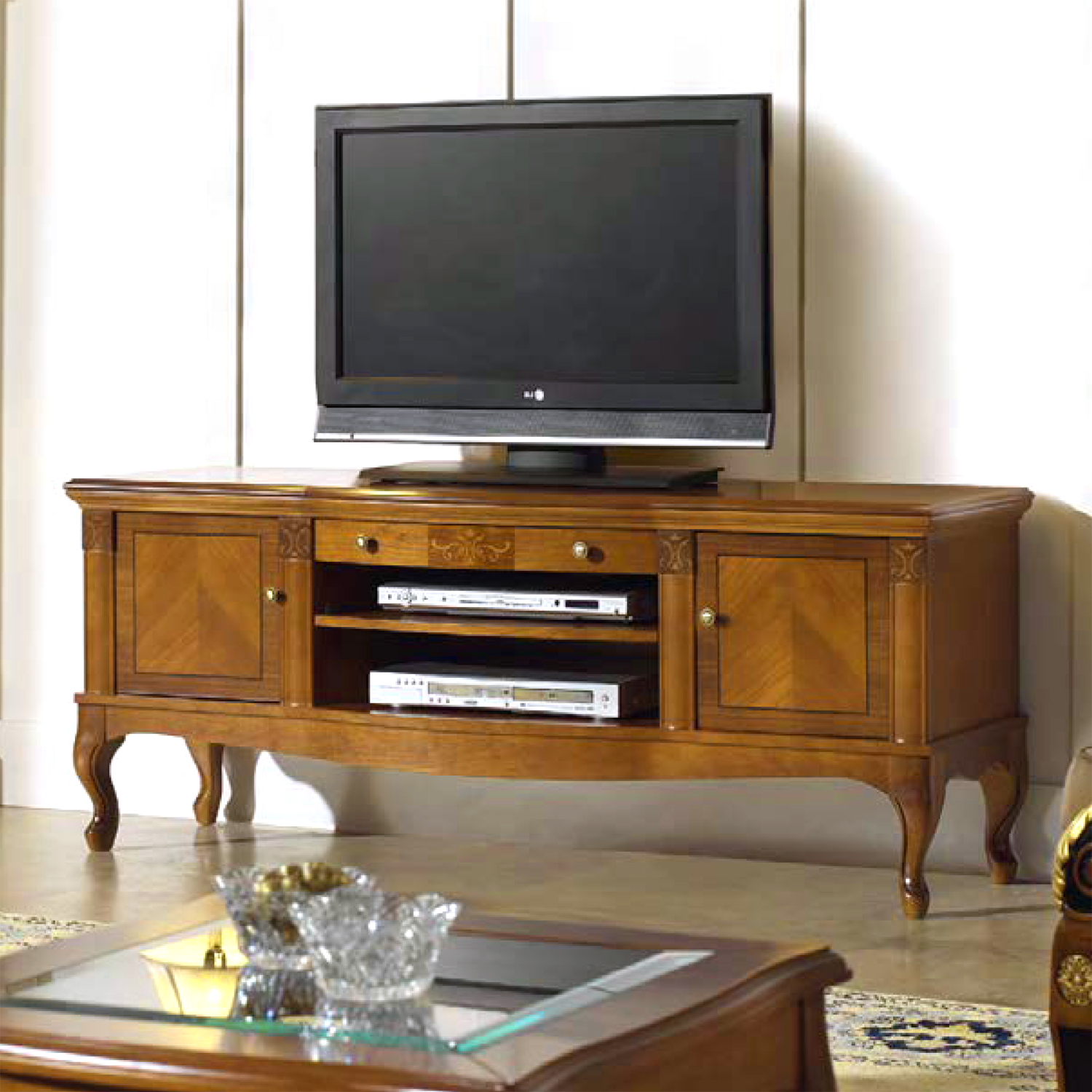 Превратите вашу гостиную или спальню в образец утончённого стиля с помощью элегантной тумбы под телевизор. Эта модель — воплощение классического дизайна: изящные изогнутые ножки с резьбой, благородная текстура натурального шпона и надёжность массива дерева.
